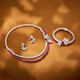 A captivating three-piece set in a platinum finish — necklace, earrings, and matching bracelet — adorned with dazzling white zircons and vibrant ruby-red stones for a touch of timeless elegance.