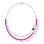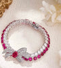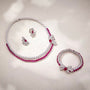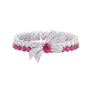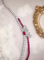 The delicate tennis-style double-strand necklace is adorned with a statement bow motif, exuding graceful sophistication. A slim tennis bracelet mirrors the design with its matching bow centerpiece, while petite bow-shaped drop earrings, each crowned with a ruby-red center, complete the ensemble. Together, they create a harmonious balance of elegance and charm, perfect for elevating.