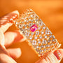 Crafted in 18K gold plating and adorned with shimmering zircon stones, this bangle radiates a luxurious aura. The intricate lattice design is crowned with a vibrant pink square stone, adding a striking pop of colour to its golden brilliance. A bangle worthy of an empress, designed to draw eyes and admiration with every movement.