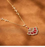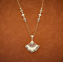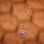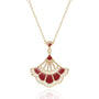 Fiery and radiant, Sunset Glow embodies the warmth of twilight skies. A golden chain leads to a fan-shaped pendant detailed with rich Agate red enamel and twinkling zircons, creating a dazzling play of colour and shine. With its scalloped silhouette and intricate craftsmanship, it is a celebration of vibrance and festivity.