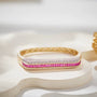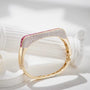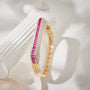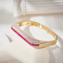 The Fuschia Glow Twist Bangle is a modern statement in luxury, blending the warmth of 18K Champagne gold plating with the vivid allure of deep fuschia stones. Its sleek, slightly twisted form is adorned with a central channel of baguette-cut fuschia stones, bordered by a dazzling spread of pavé-set clear zircons for maximum brilliance.