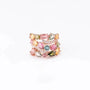 A vintage inspired statement ring crafted in premium brass and finished in a high shine rose gold plating for a warm, feminine glow. Set with natural tourmaline in a dreamy mix of blush pink, olive green, honey yellow, and ocean blue tones, and detailed with micro set zircon for that extra sparkle. Resizable for a perfect fit, Gaia is bold, elegant, and designed to look rare from every angle, an instant upgrade for office wear and special days.