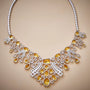 A masterpiece of grandeur, Golden Cascade is a necklace and earring set plated in 18K gold in premium zircons that flows like liquid sunshine. Drenched in radiant yellow zircons and paired with icy white brilliance, this set captures the drama of opulence with every facet. Its intricate arrangement of oval, pear, and emerald cuts creates a striking waterfall effect, making it a true show-stopper.