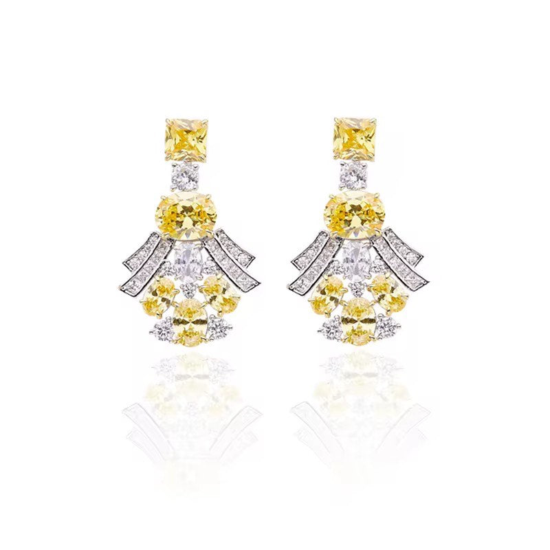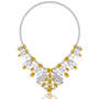 Necklace: Statement length with a cascading arrangement of mixed-cut yellow and white stones, centered with a bold emerald-cut gem.