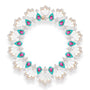 A Radiant Bracelet that mirrors the splendour of its matching necklace — crafted with luminous mother-of-pearl fans edged in sparkling pavé, alternating with turquoise enamel accents embracing deep ruby-pink teardrops, and linked by clusters of brilliant white stones and electroplated in Rose Gold.