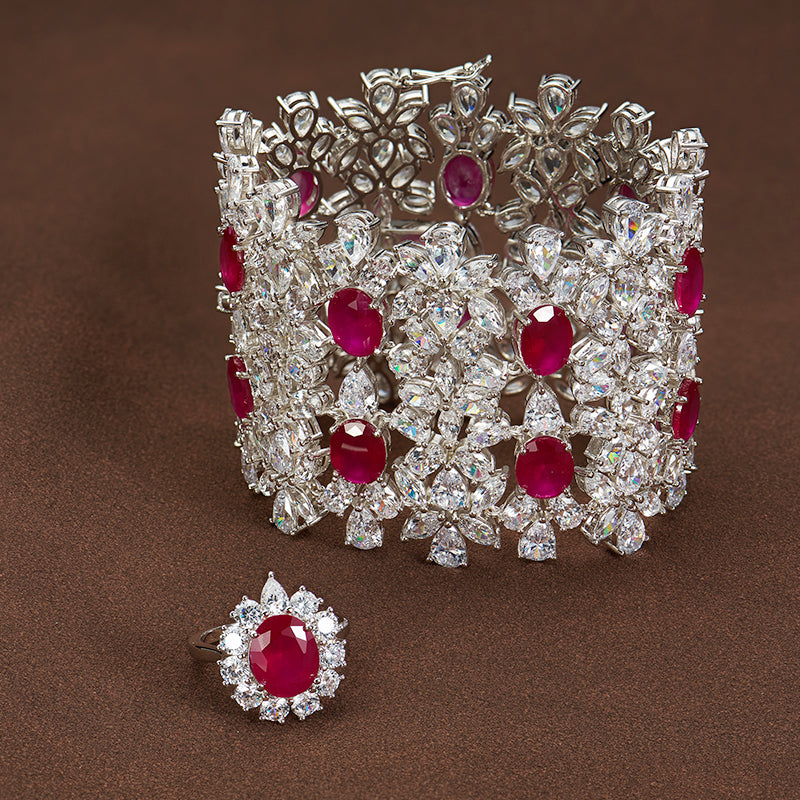 Its wide, regal band is crafted in a shimmering rhodium-plated with platinum finish, intricately set with high-quality pear-shaped and round-cut clear zircons that form a sparkling floral lattice.