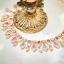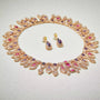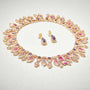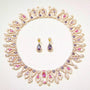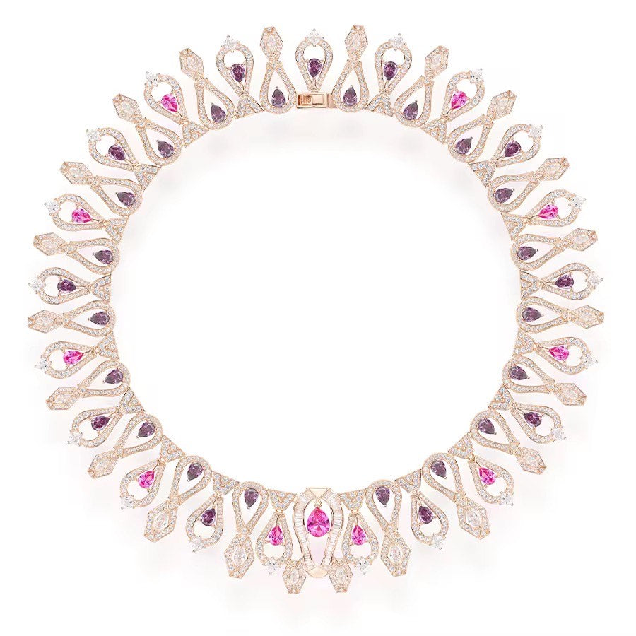 Starlight Dew is a masterpiece of colour, sparkle, and grace. The necklace embraces the neckline in a seamless collar of rose-gold brilliance, where pear-cut violet, fuchsia pink, and champagne stones dance alongside glistening white zircons.